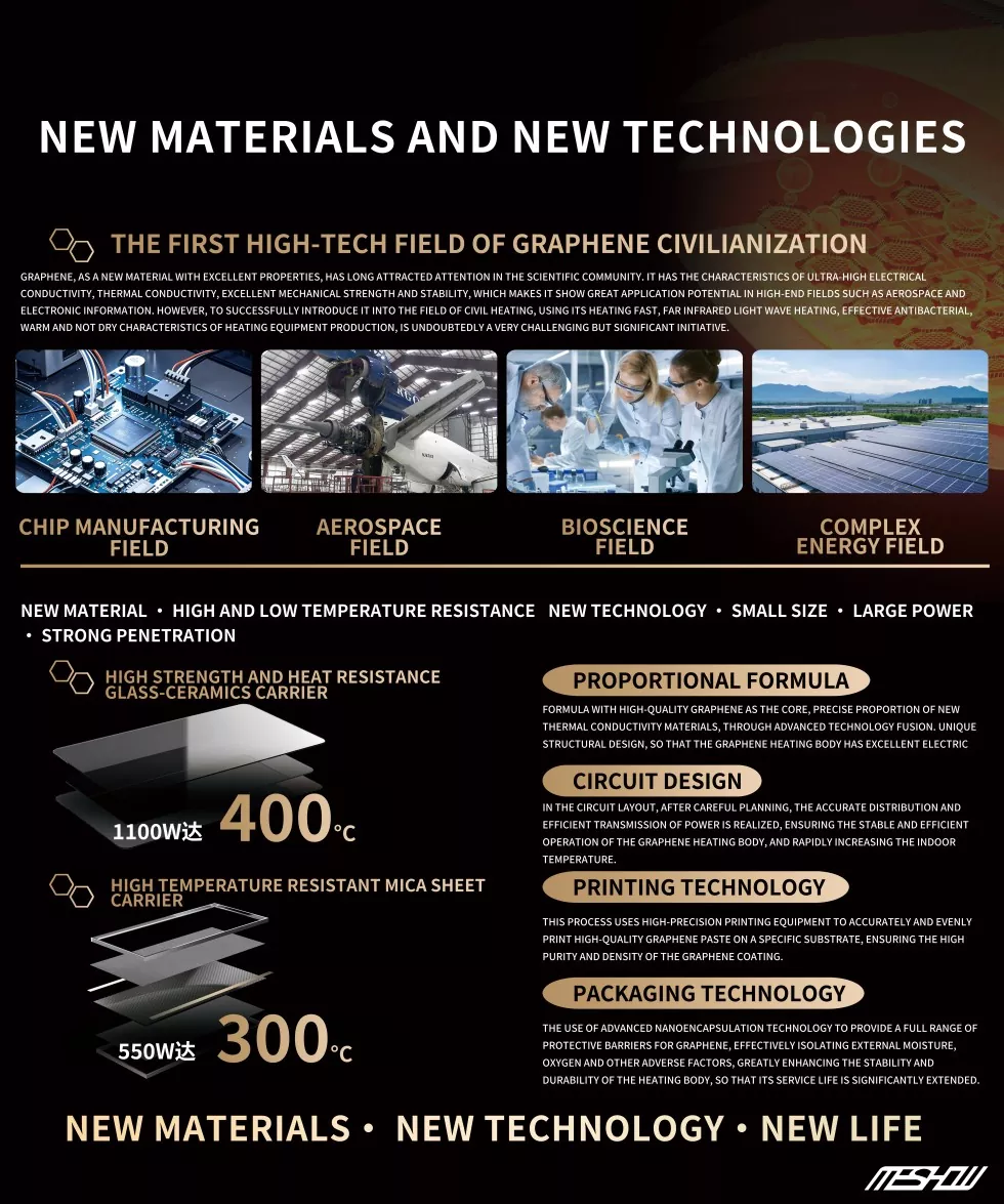 Meshow هو مورد قوي قام بنجاح بتطوير سخان كهربائي من ألواح الجرافين الأبيض 1100 واط. يوفر سخان الجرافين بيئات منزلية ذكية ودافئة ومريحة للمستخدمين المحليين والأجانب ، مما يؤدي إلى الاتجاه الجديد للتدفئة في الداخل والخارج!